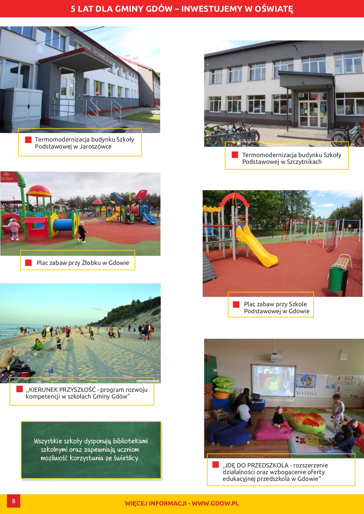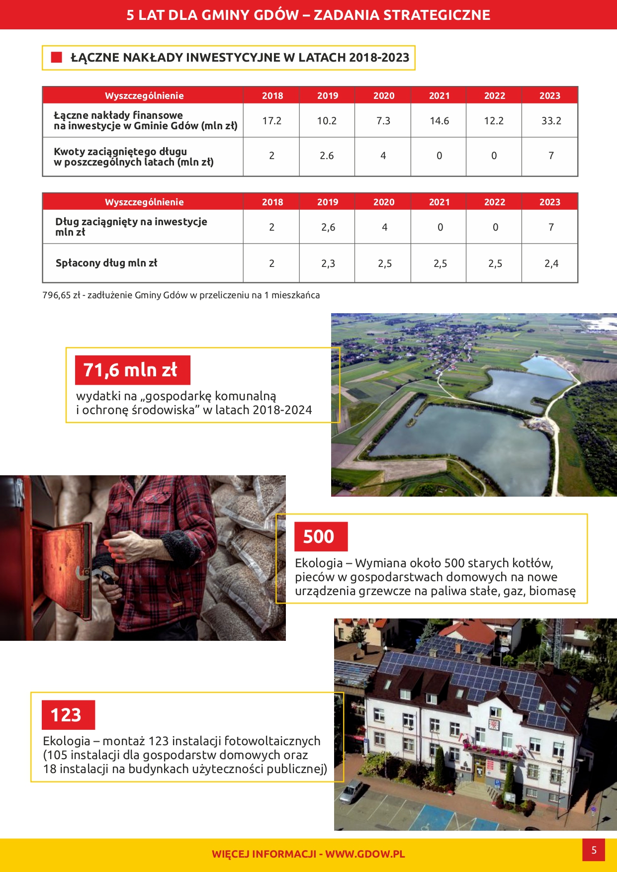 Skąd pomysł, aby pokazać Wam mijające 5 lat w „fotograficznym” skrócie? Bo na tych fotografiach znajdziecie realne efekty działań: wyremontowane szkoły, świetlice, remizy, drogi, działania w obszarze pomocy społecznej, sportu, gospodarki komunalnej, ochrony środowiska, ekologii, kultury. Przeczytacie o REALNYM zadłużeniu naszej Gminy czy kosztach funkcjonowania oświaty…