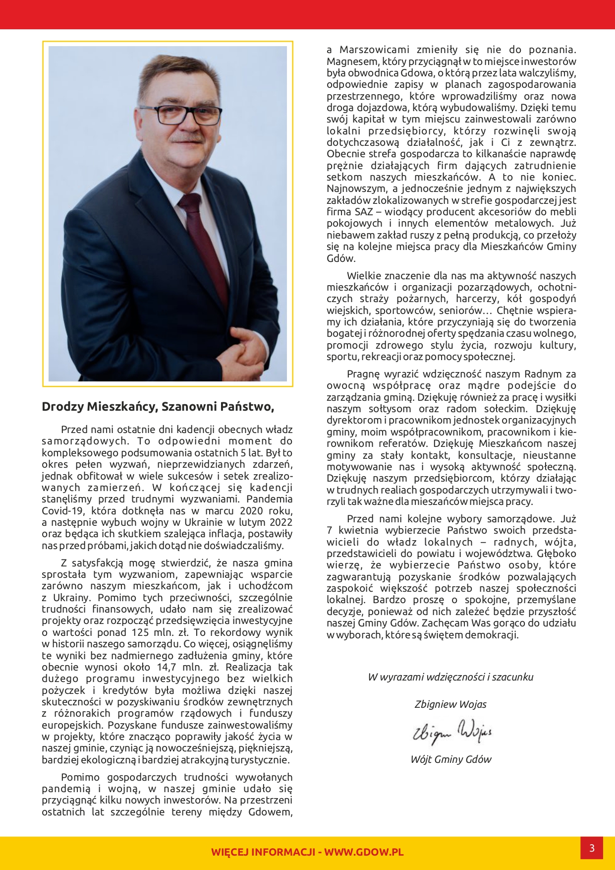 * Nazywam się Józef Wcisło. Jestem przedsiębiorcą, właścicielem marketów budowlanych w Gdowie i Niepołomicach. Zdecydowałem się zabrać głos, ponieważ przed nami ważna decyzja. Gospodarka wymaga stabilności i przewidywalności, dlatego uważam, że najlepszym kandydatem na wójta jest Zbigniew Wojas. Stworzył strefę gospodarczą, która prężnie się rozwija, a podatki płacone przez mieszkańców i przedsiębiorców utrzymywane są na możliwie niskim i stabilnym poziomie, co zachęca do inwestowania właśnie w Gminie Gdów. Obawiam się, że jeżeli zmieniłby się wójt to podatki lokalne zostaną znacznie podniesione, bo skądś trzeba znaleźć fundusze na realizację kosztowych, a nie do końca trafionych obietnic wyborczych.