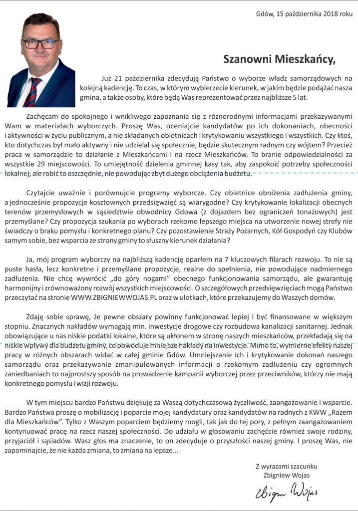 Już w najbliższą niedzielę wybierzemy swoich przedstawicieli do samorządu gminnego, powiatowego i wojewódzkiego. Zachęcamy więc do spokojnego zapoznania się z informacjami zawartymi w ulotkach, na plakatach lub przekazywanych za pośrednictwem mediów i podjęcia świadomej decyzji. Poniżej prezentujemy list, który w ostatnich dniach kandydat na wójta Gminy Gdów Zbigniew Wojas skierował do naszych mieszkańców. Zapraszamy do lektury.