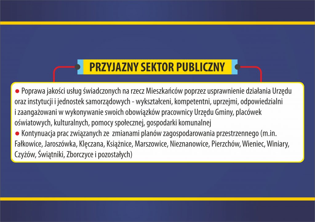 Siódmy, ostatni filar programu wyborczego – PRZYJAZNY SEKTOR PUBLICZNY czyli poprawa jakości usług świadczonych na rzecz Mieszkańców.