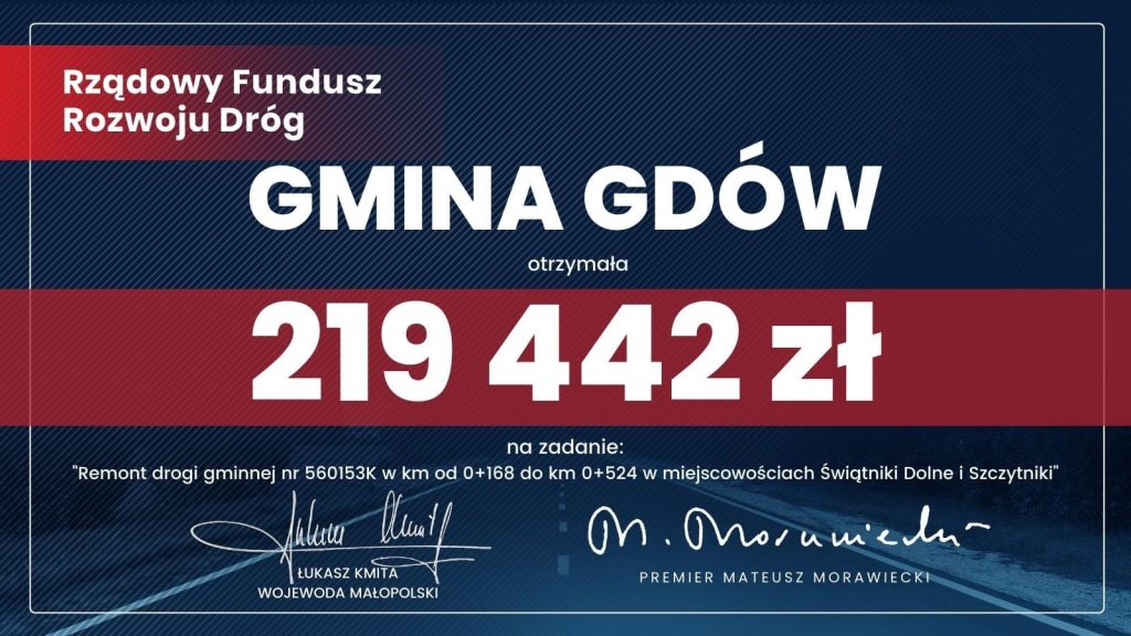 Gmina Gdów otrzymała na to zadanie 219 422 zł z Rządowego Funduszu Rozwoju Dróg.